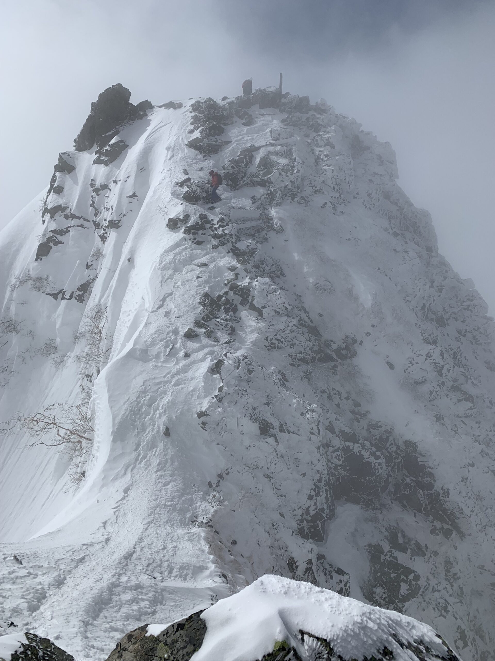 ロープウェイアクセスで西穂山荘までは2時間程度で到着。全体的に急斜面はありませんが、独標近くは雪と岩のミックスとなり、落ち着いて安定したアイゼン歩行が必要です。ショートロープでの歩行です。